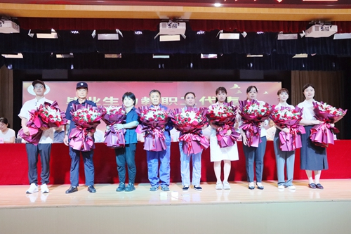 毕业生为学院教职工代表献花。