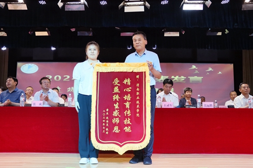 毕业生代表,建筑工程学院饶佳蔓同学回顾了在校期间的点滴经历,表示将永远铭记“明德、笃行、精技、强能”的校训精神,在未来的道路上不断追求卓越、勇攀高峰。并代表毕业生向学院赠送锦旗,总会计师吴运胜代表学院接受锦旗。
